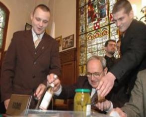 Ciąg dalszy miał miejsce wczoraj. Sesja rozpoczęla się od happeningu Młodzieży Wszechpolskiej, która radnemu SLD Adamowi Szewczykowi (na zdjęciu) przyniosła prezenty: pół litra wódki, kieliszek i słoik ogórków. Młodzi działacze w ten sposób wyrazili swoją dezaprobatę dla postawy radnego, który - jak fama głosi - wylądował w Izbie Wytrzeźwień.