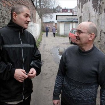| Leszek Dudziński i Andrzej Śliwiński w wąskim dojściu do swoich mieszkań. Urzędnicy radzą im się do tego przyzwyczaić. |