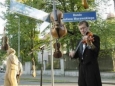 Skrzypce wiszące na drzewie, wiolonczelista grający na środku skrzyżowania i kamień z mosiężną tablicą na trawniku...